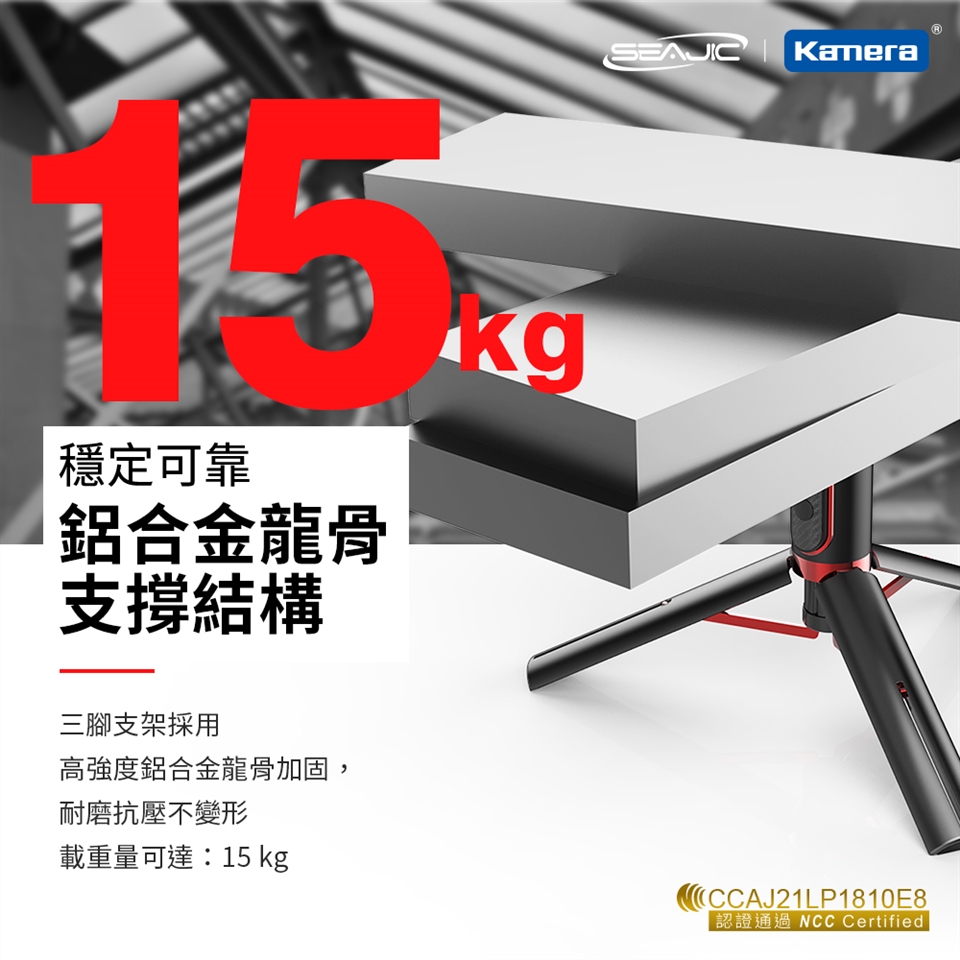 - 鋁合金龍骨支撐結構,腳架承重大於15Kg