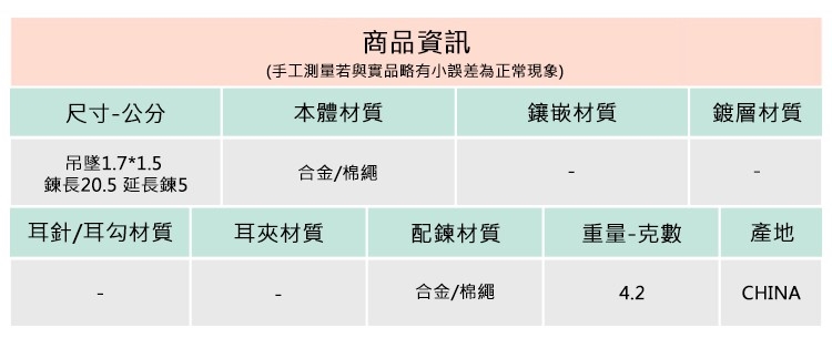 ◆合金飾品一經使用可能隨時間失去光澤或褪色,此為正常物理現象,妥善使用保存可延長飾品壽命。