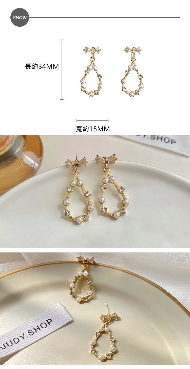 【SECRET BOX】韓國設計S925銀針唯美圈圈珍珠美鑽蝴蝶結造型耳環