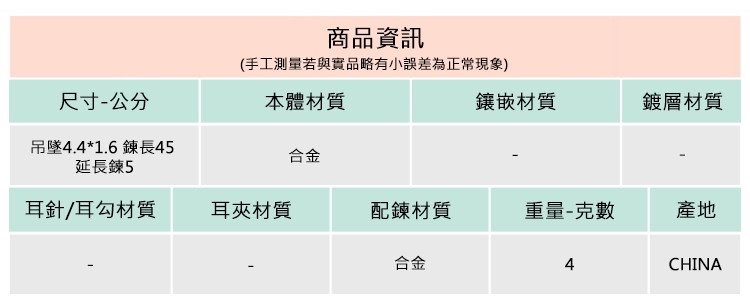 ◆合金飾品一經使用可能隨時間失去光澤或褪色,此為正常物理現象,妥善使用保存可延長飾品壽命。