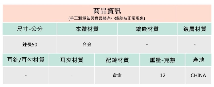 ◆合金飾品一經使用可能隨時間失去光澤或褪色,此為正常物理現象,妥善使用保存可延長飾品壽命。