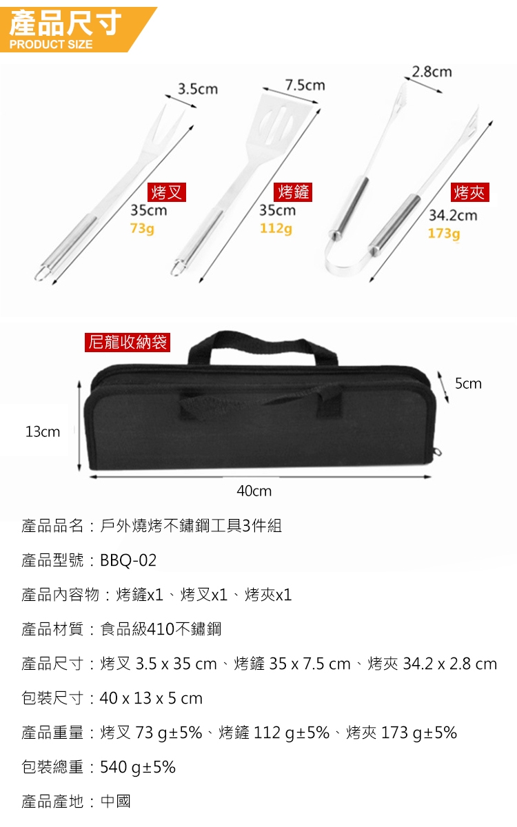 產品重量:烤叉 73 g±5%、烤鏟 112 g±5%、烤夾 173 g±5%