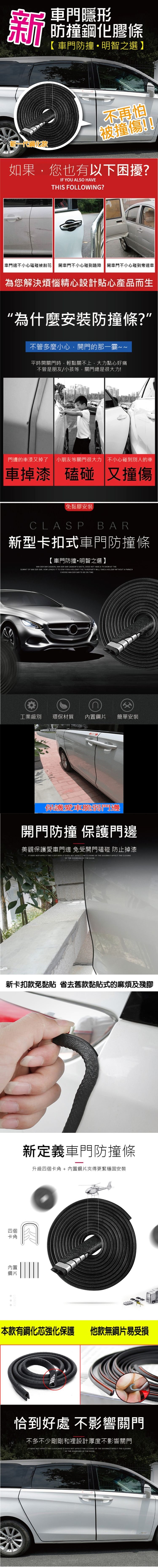 開車門一不小心容易撞擊到牆面,簡單一條免黏式 車門隱形防撞鋼化膠條 解決所有困擾!新升級款 免黏貼式, 省去舊款安裝的費力及移除時的殘膠, 膠條裡包覆不鏽鋼片,1.7mm厚,比舊款更厚更安全更強固,採用高彈性環保TPO材質製成,經久耐用,背後採用牆裡雙面膠黏貼,耐高溫、防水,可持久使用,安裝方便,貼上後不僅有防護作用且美觀大方!