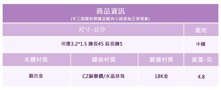 ◆合金飾品一經使用可能隨時間失去光澤或褪色,此為正常物理現象,妥善使用保存可延長飾品壽命。