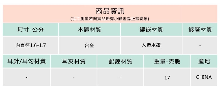 ◆合金飾品一經使用可能隨時間失去光澤或褪色,此為正常物理現象,妥善使用保存可延長飾品壽命。