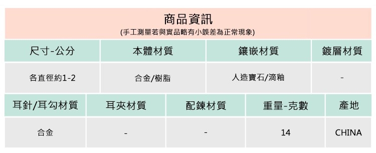 ◆合金飾品一經使用可能隨時間失去光澤或褪色,此為正常物理現象,妥善使用保存可延長飾品壽命。