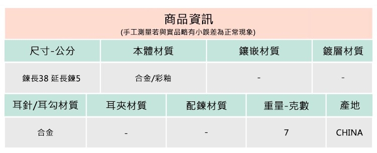 ◆合金飾品一經使用可能隨時間失去光澤或褪色,此為正常物理現象,妥善使用保存可延長飾品壽命。