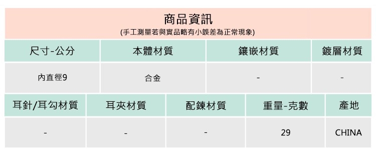◆合金飾品一經使用可能隨時間失去光澤或褪色,此為正常物理現象,妥善使用保存可延長飾品壽命。