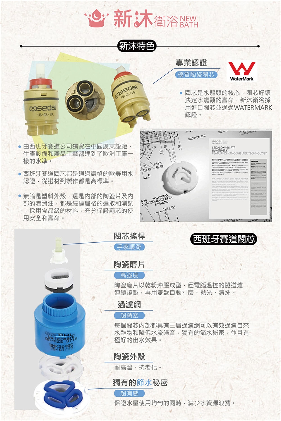 ❤【watermark認證閥芯】❤閥芯是水龍頭的核心,閥芯好壞決定水龍頭的壽命,新沐衛浴採用進口閥芯並通過WATERMARK認證。