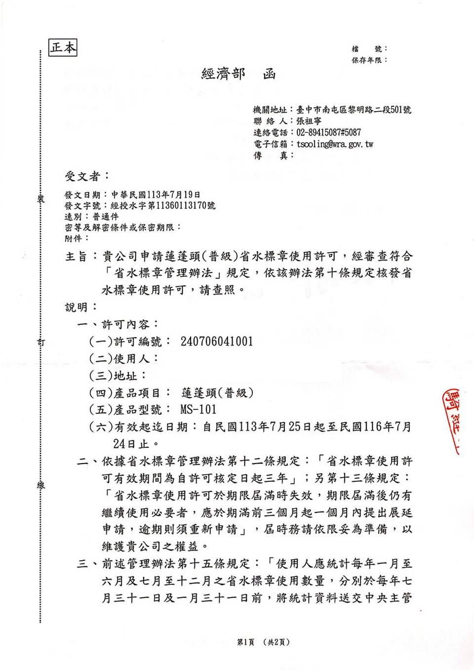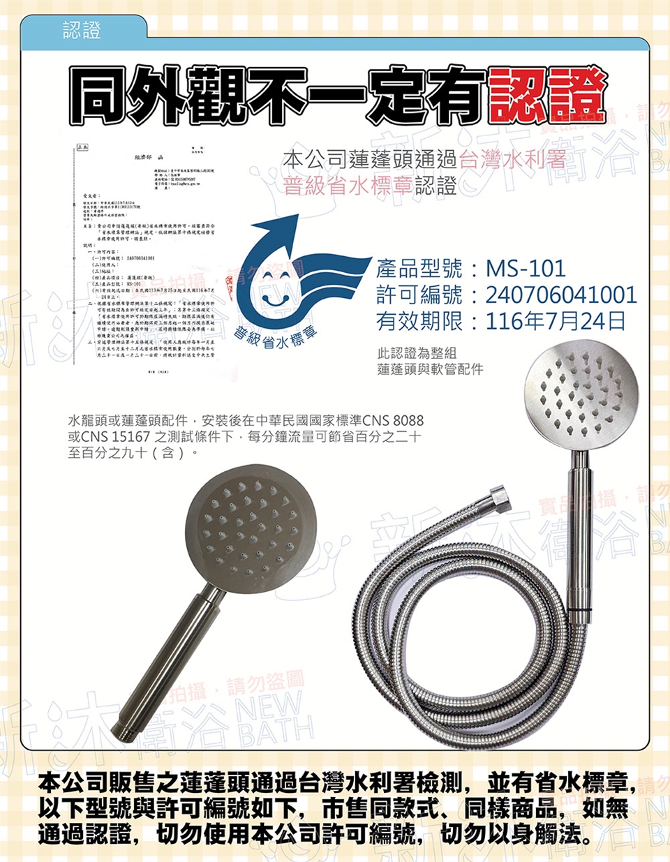 本賣場販售之蓮蓬頭通過台灣水利署檢測,並有省水標章,型號與許可編號如上,市售同款式、同樣商品,如無通過認證,切勿使用本公司許可編號,切勿以身試法。