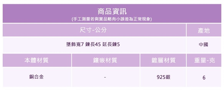 ◆合金飾品一經使用可能隨時間失去光澤或褪色,此為正常物理現象,妥善使用保存可延長飾品壽命。
