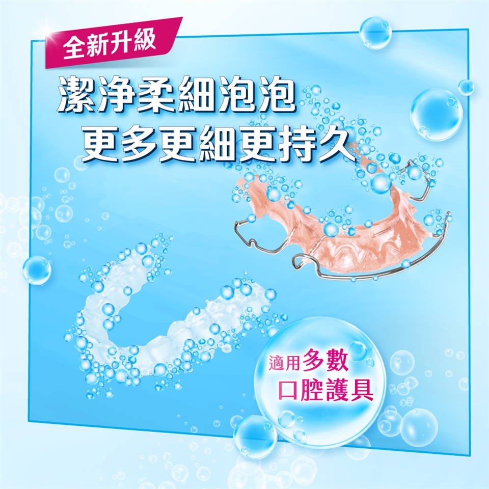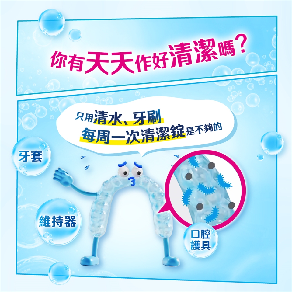 4.本產品係於容器中使用,切勿直接放入口中,使用清潔錠後請用清水將口腔護具徹底沖洗乾淨。