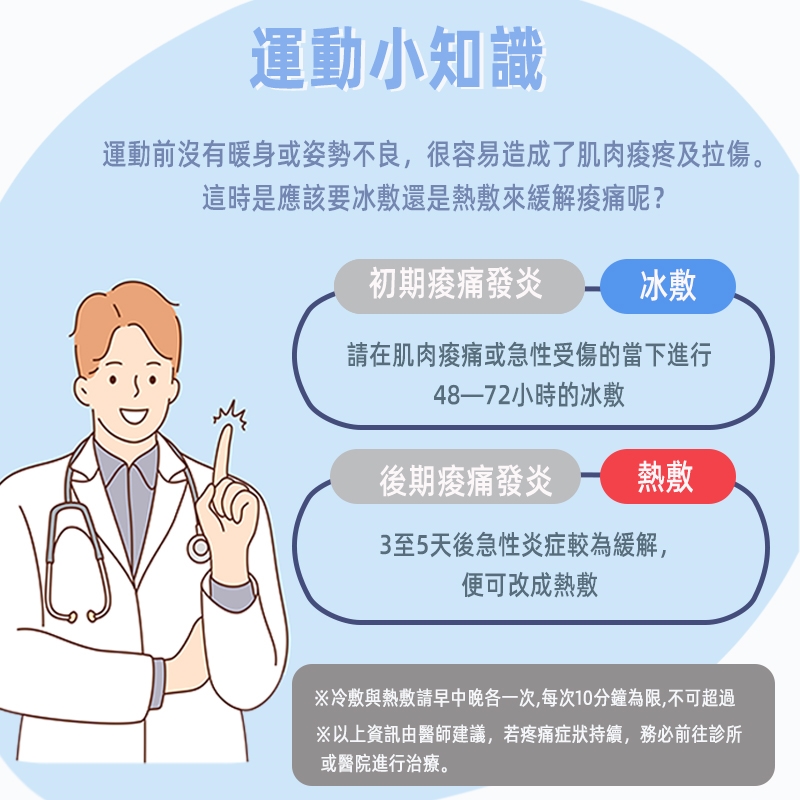 ●冰敷時間不建議超過10分鐘,長時間使用冷療法可能造成傷害。