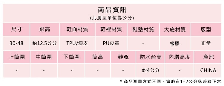 2.鞋類商品依功能及用途之不同,鞋底各有其止滑係數之個別不同,使用鞋類商品請用於正常平坦之路面,非雨鞋或雨靴類商品,請避免穿著於下雨濕滑路面上行走。