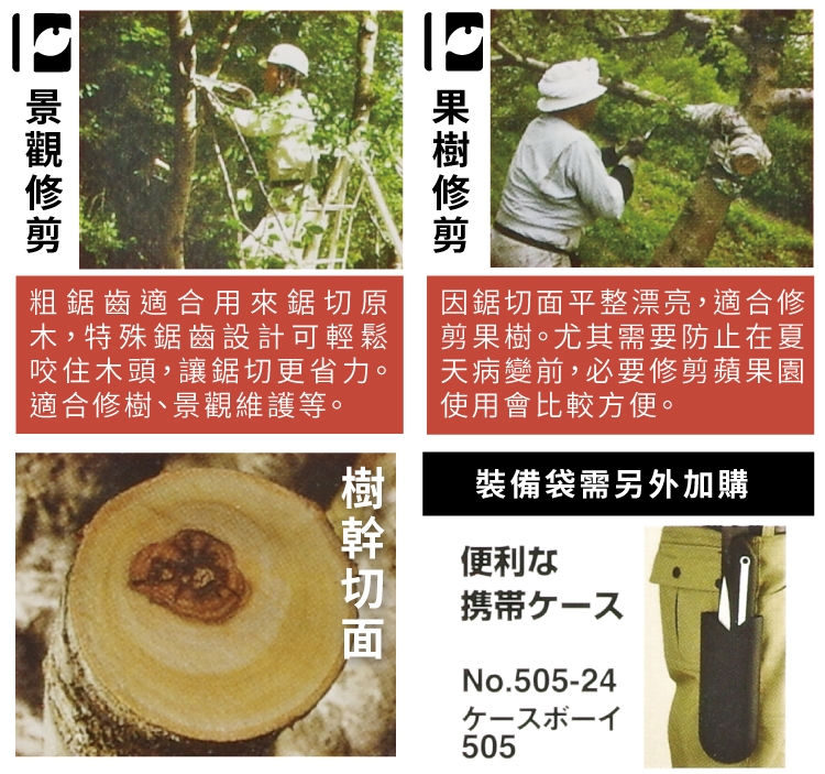 鋸片較厚且鋸片可收合,攜帶方便;木材初級加工時使用,適合樹木修剪,可將原木橫、緃切斷。