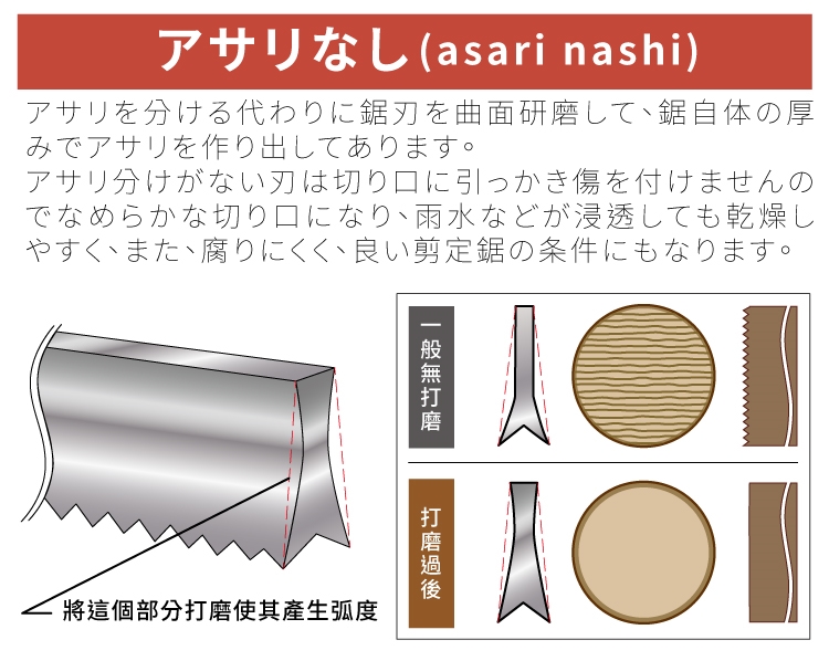 原文的意思是將鋸刃的側邊進行曲面研磨,另鋸片切進木頭時可產生縫隙,不容易因此貼緊木頭而導致多於摩擦,過多的摩擦會造成粗糙毛邊切面。而此加工方法消除了這個像是蛤蜊殼般的凹凸表面,因取名為アサリなし(asari nashi)。