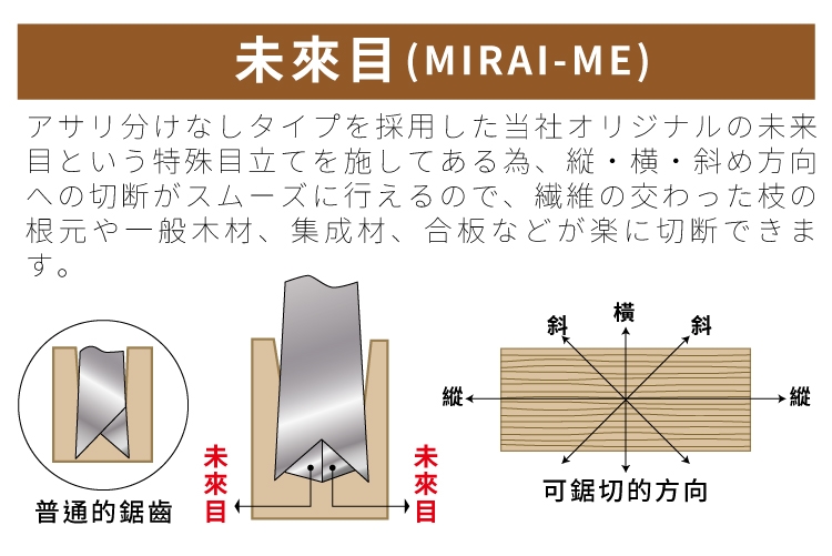 相較於一般的鋸齒只能單一方向做切割,這個未來目(MIRAI-ME)可以在垂直,水平和對角線方向切割,讓使用上更可以靈活運用。