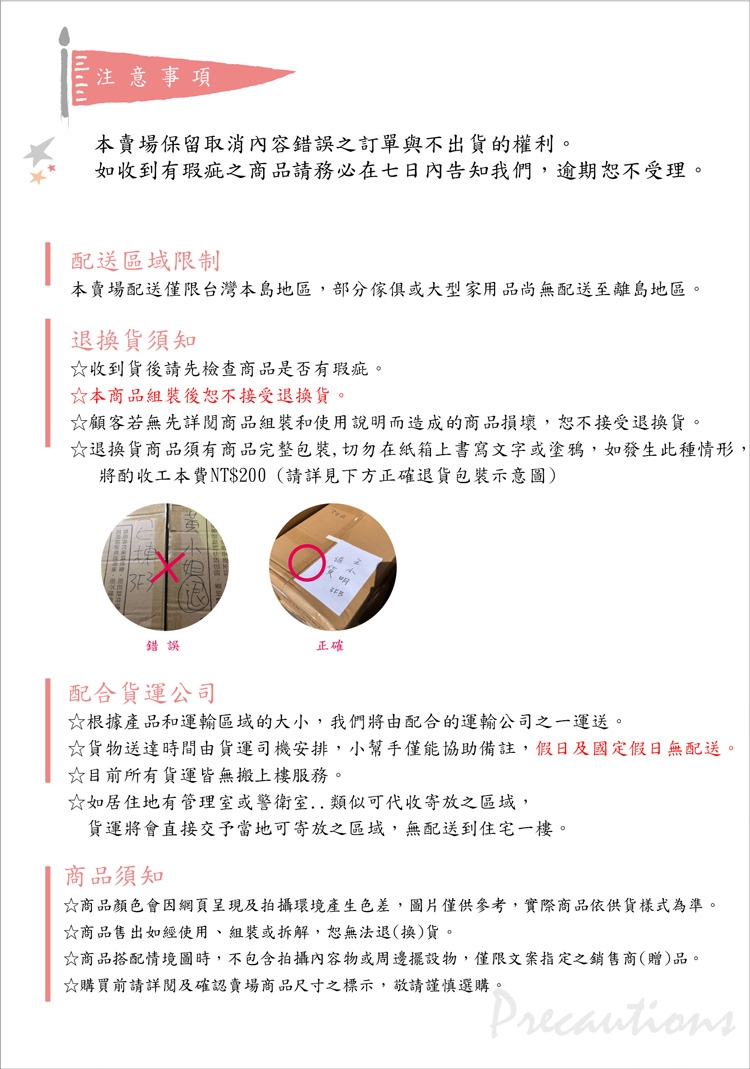 ▲商品需退換貨時必須為寄出時完整狀態(商品本身、配件包裝、外箱),商品有組裝後痕跡及任何破損皆無法受理退貨。