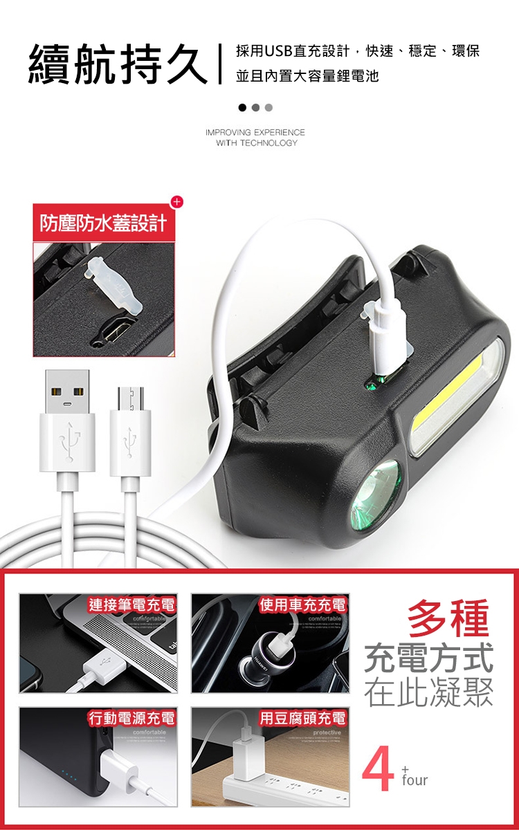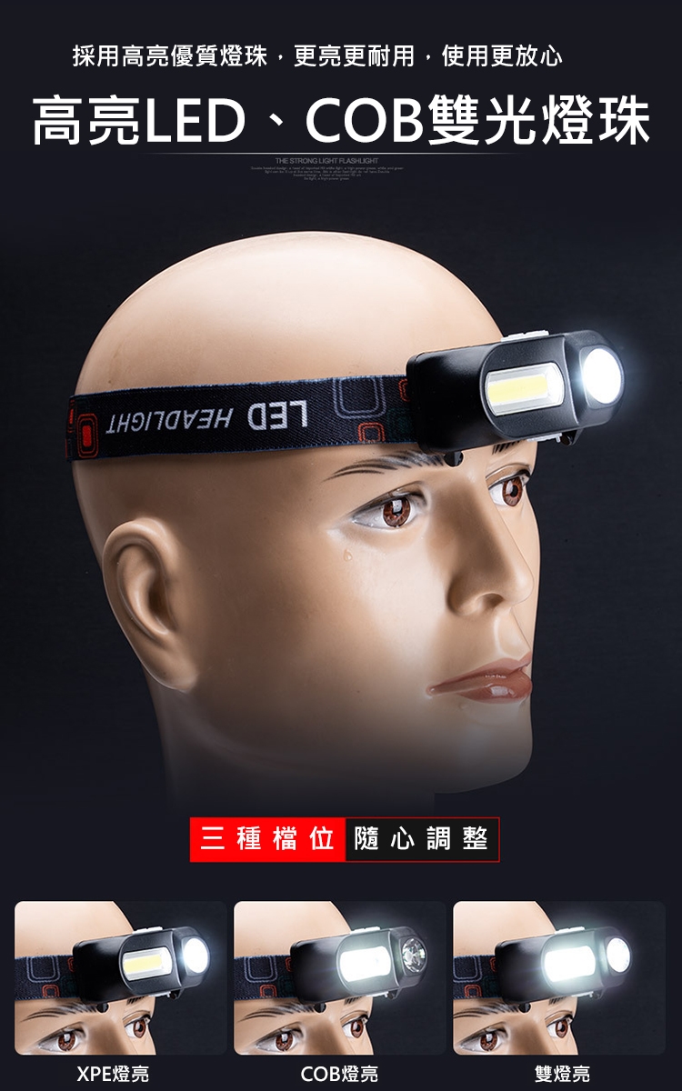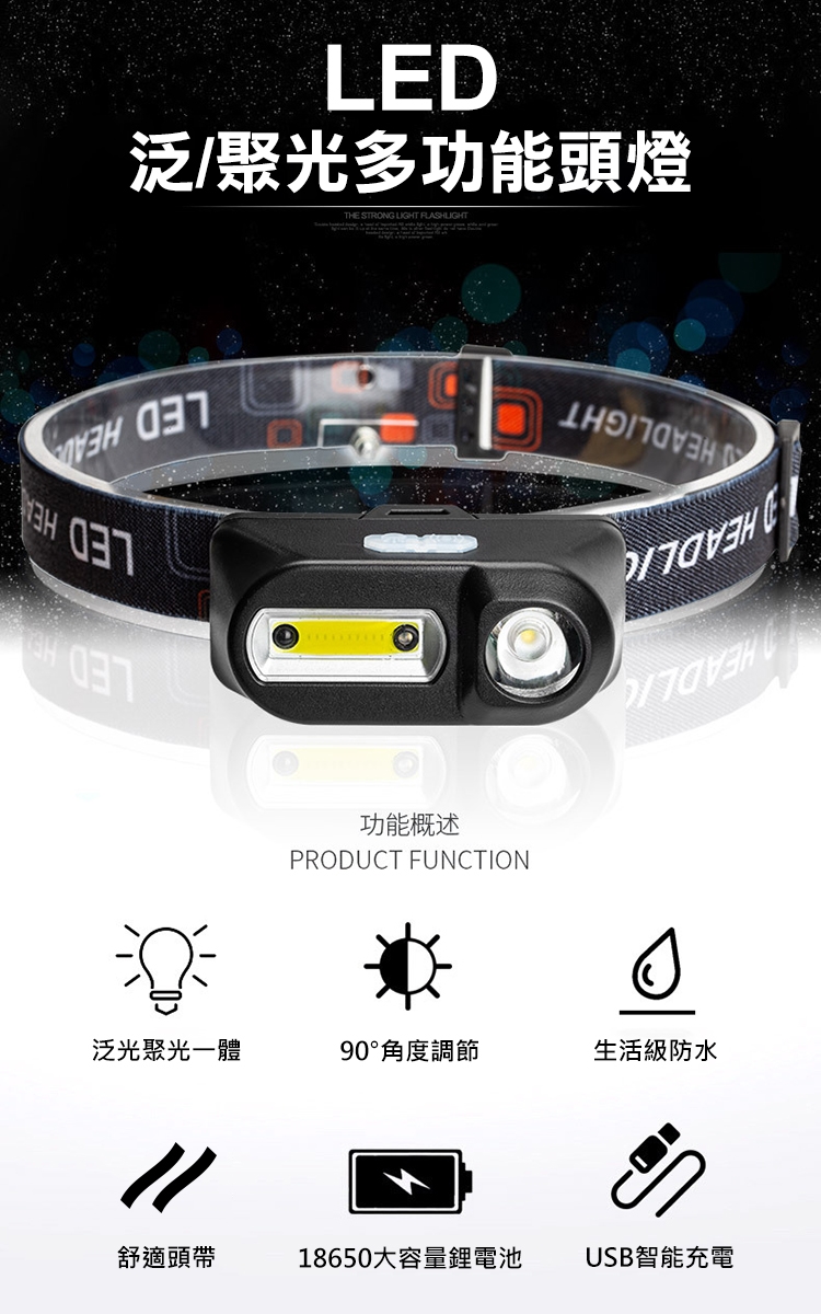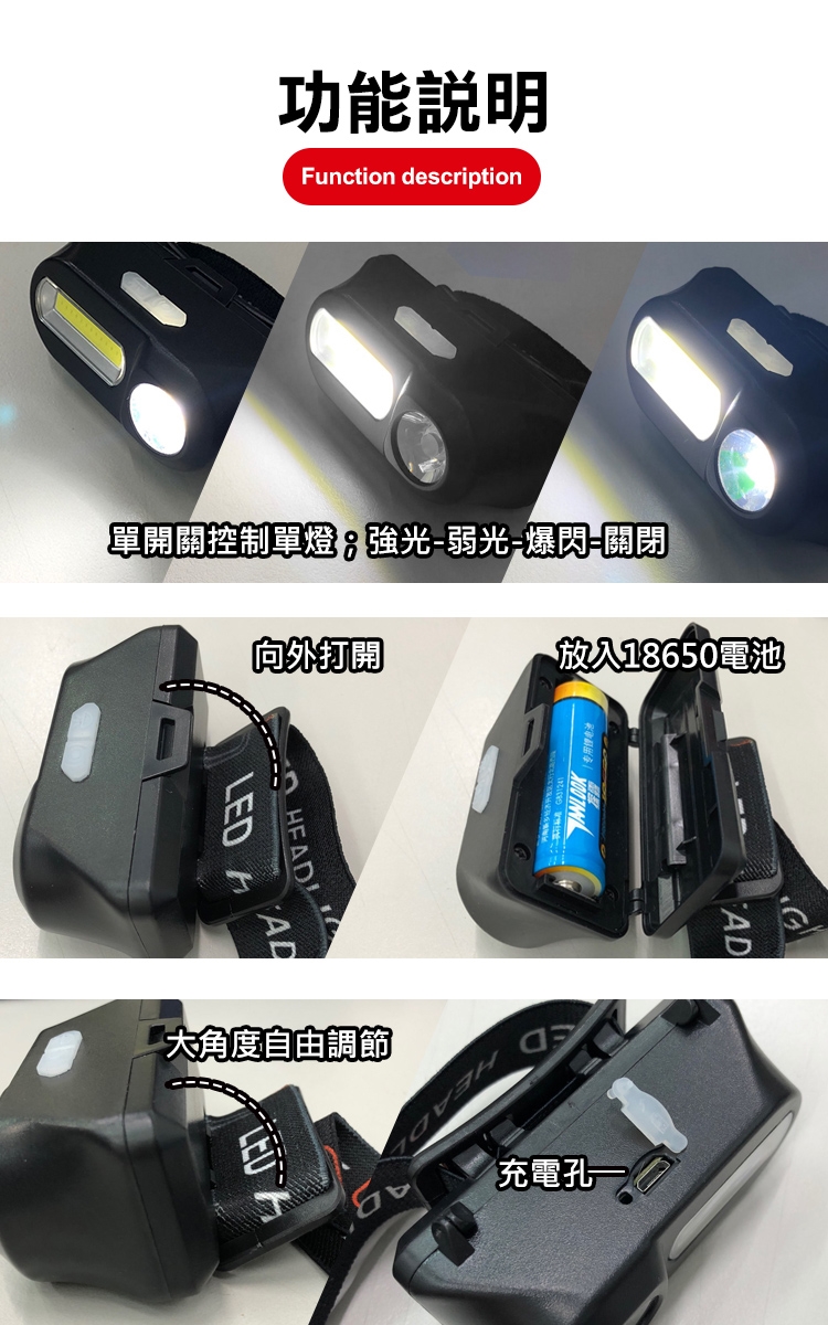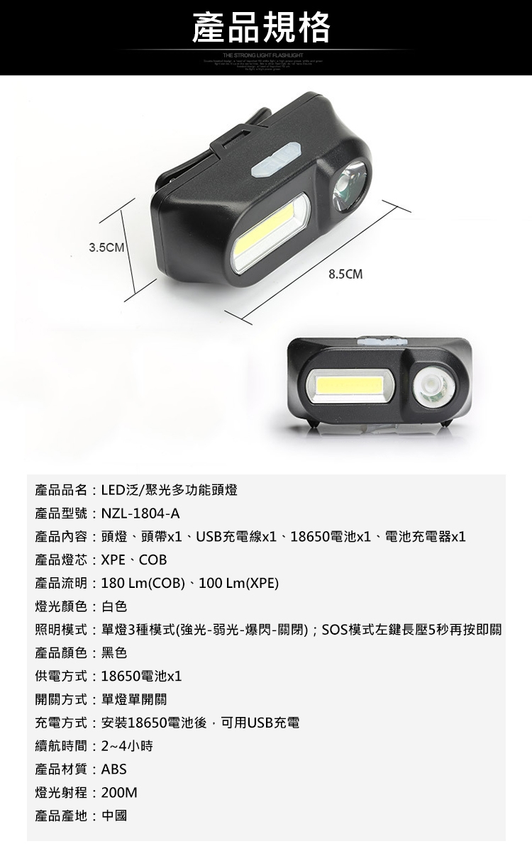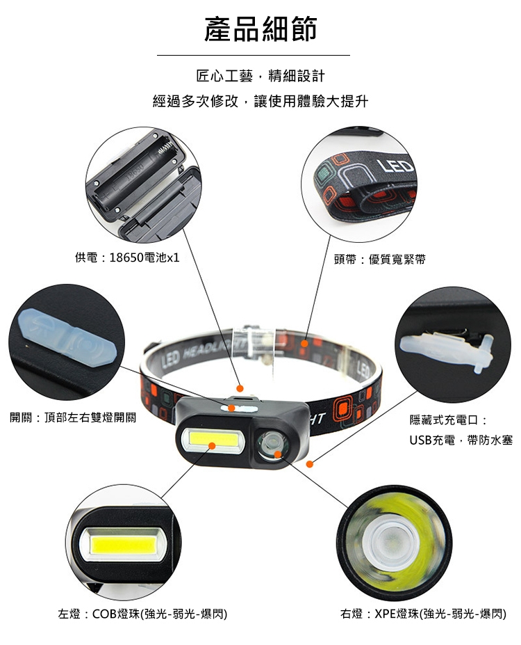 產品內容:頭燈x1、USB充電線x1、18650電池x1、充電器x1、頭帶x1