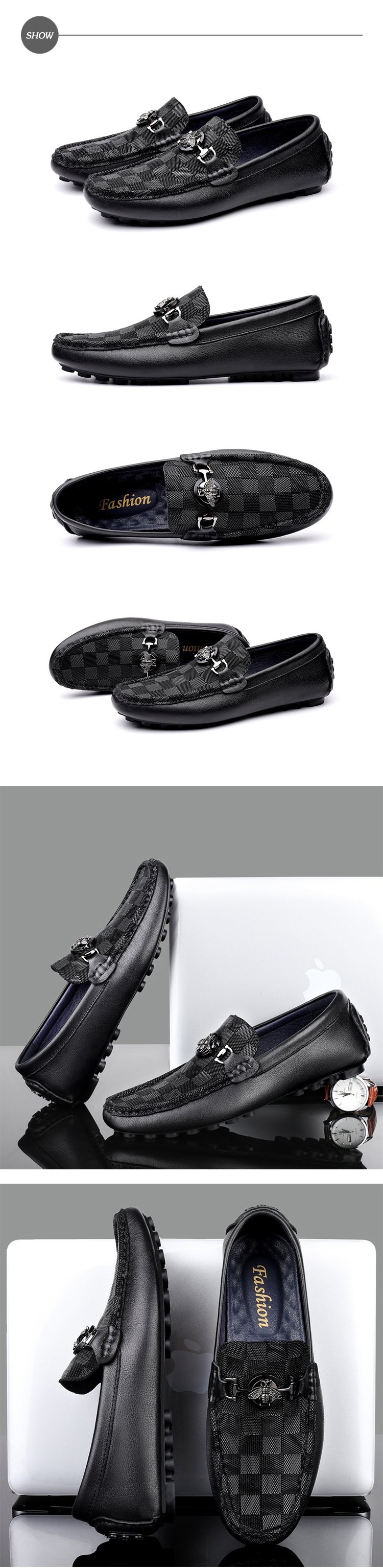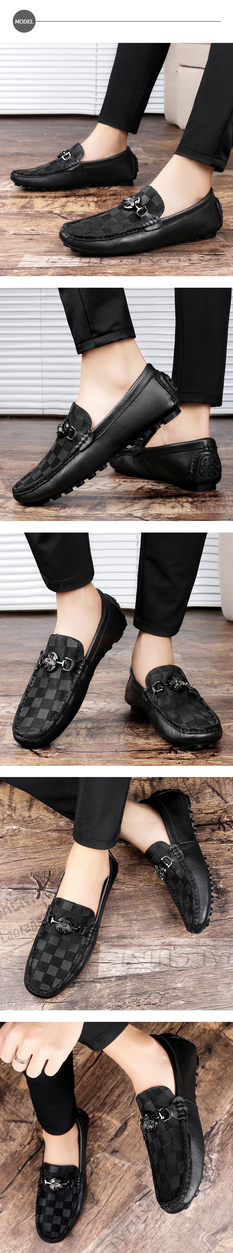 【ANSEL】真皮樂福鞋豆豆鞋/真皮頭層牛皮棋盤格紋小蜜蜂馬銜釦造型樂福豆豆鞋-男鞋  黑