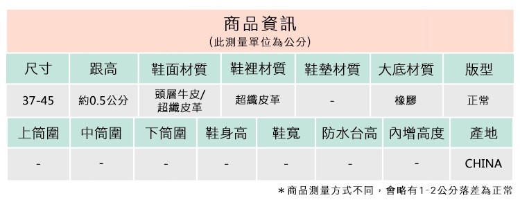 2.鞋類商品依功能及用途之不同,鞋底各有其止滑係數之個別不同,使用鞋類商品請用於正常平坦之路面,非雨鞋或雨靴類商品,請避免穿著於下雨濕滑路面上行走。