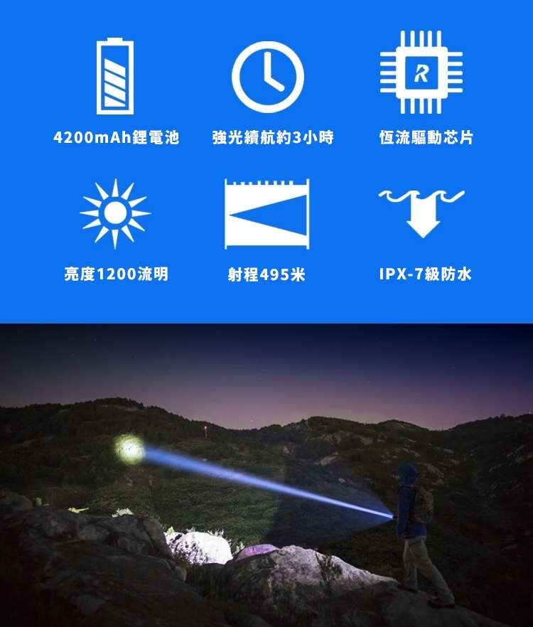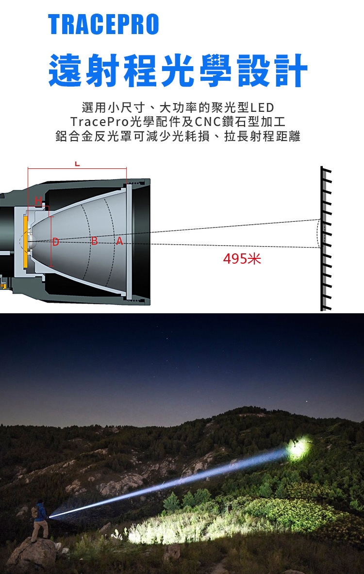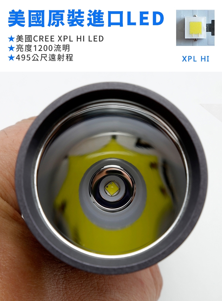 ●使用美國CREE XPL HI燈珠,亮度1200流明,495公尺遠射程