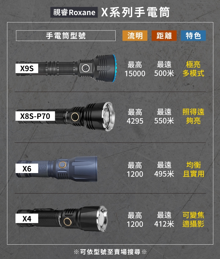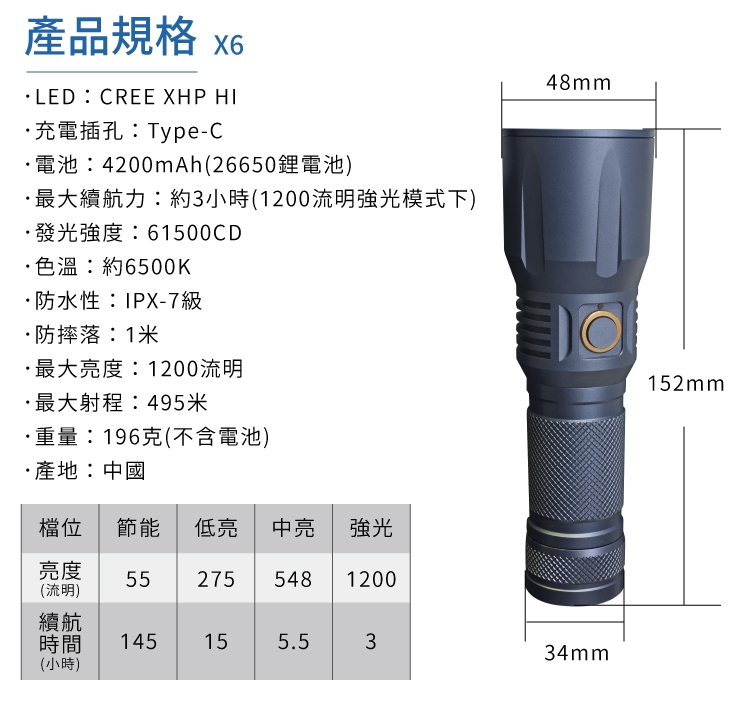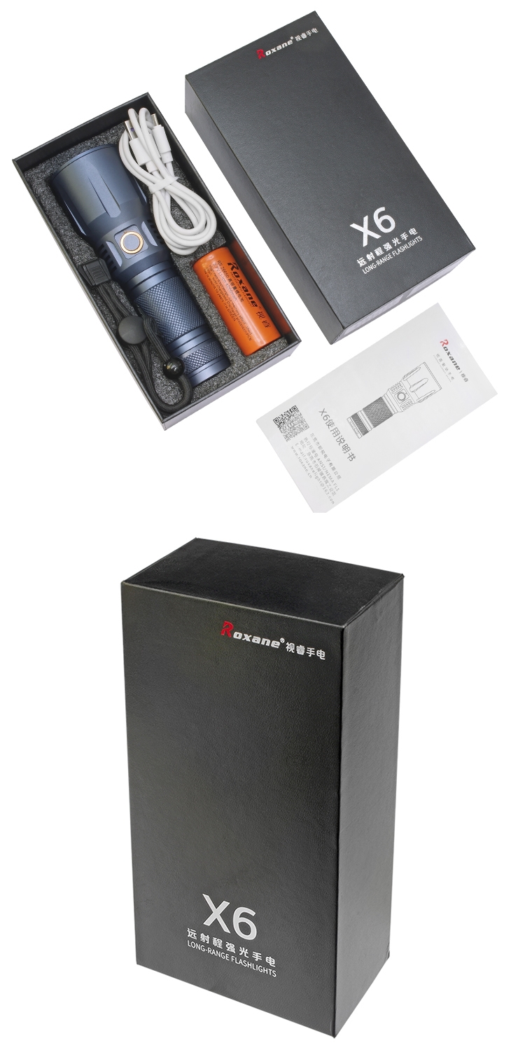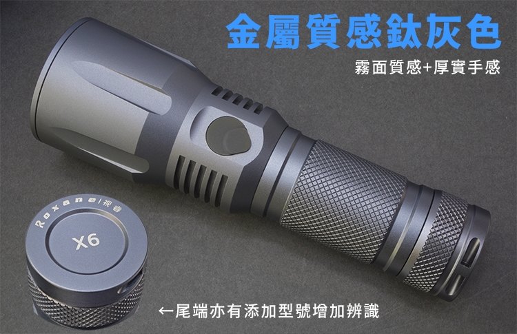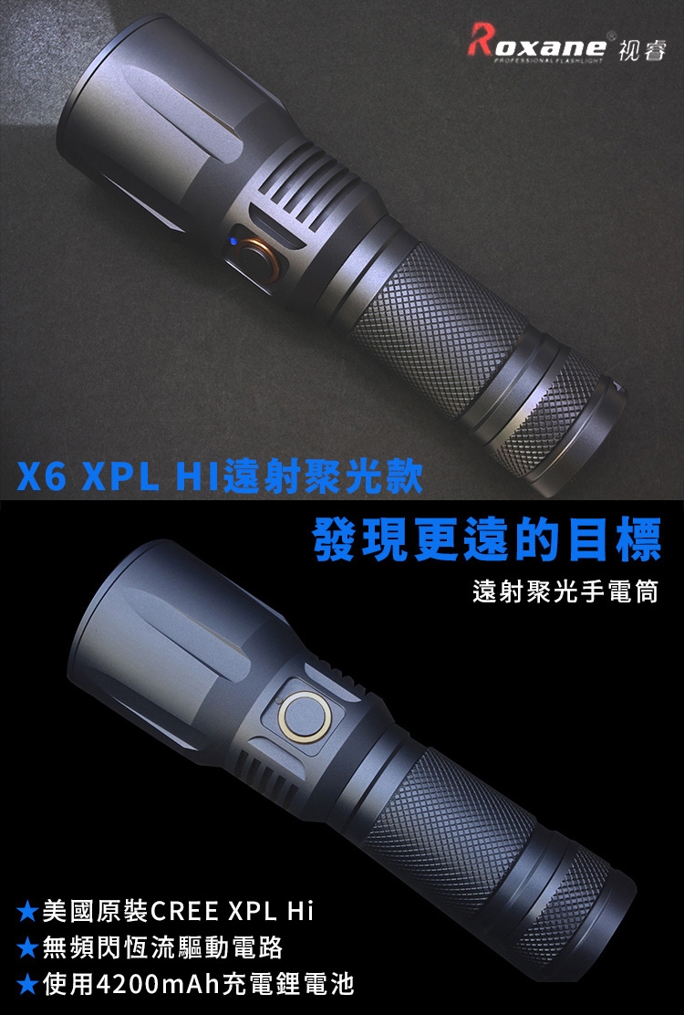 ●【品名】視睿Roxane美國CREE遠射XPL HI防水LED強光手電筒組X6(USB-C充電/射程495米/亮度1200流明/TracePro仿真光杯/IPX-7/4檔+雙擊暴閃)