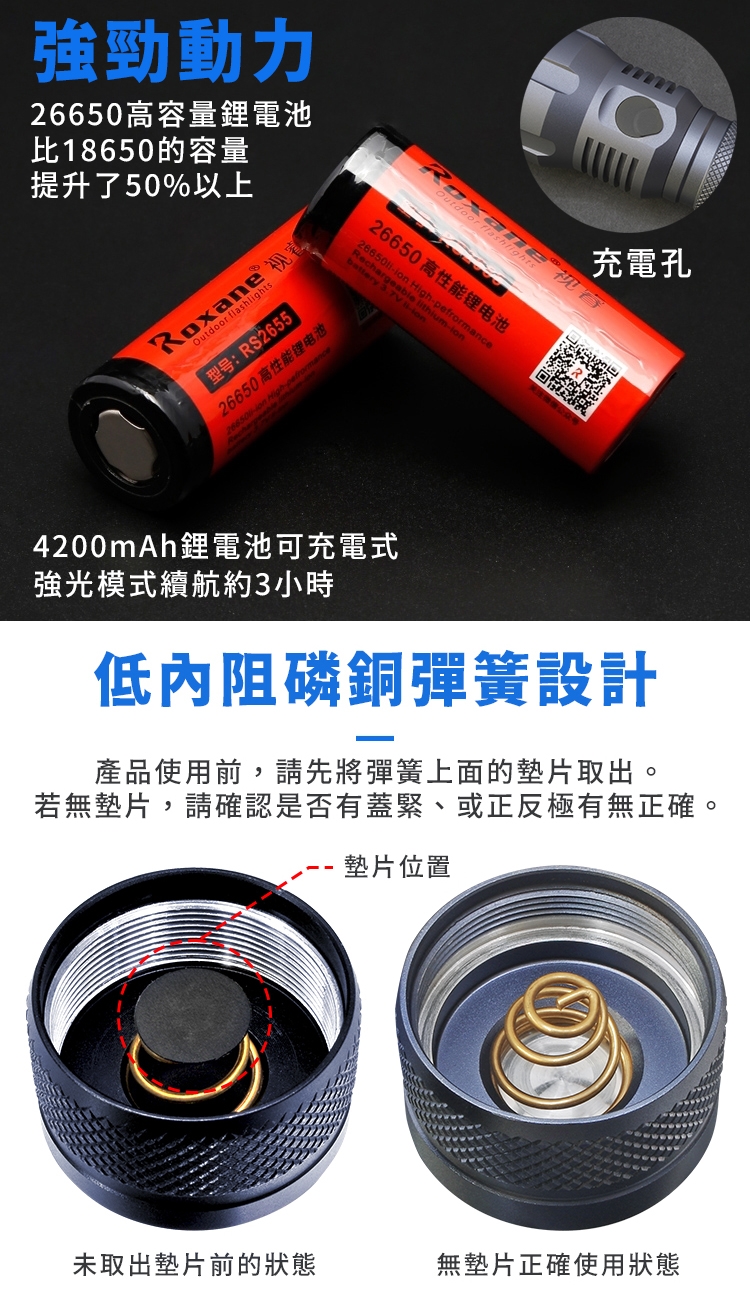 ●26650可充電鋰離子(Li-ion)電池屬於工業電芯,並非有安全保障的民用電池,當電池品質不良或者使用不當(短路、高溫等等)時可能發生燃燒爆炸並危及人身和財產安全,若使用此電池種類應明白其中的風險!使用品質優秀並帶有保護電路的鋰離子電池會在一定程度上降低風險。建議盡量使用ROXANE視睿原裝電池及充電器。
