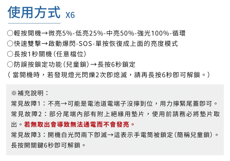常見故障3:開機白光閃兩下即滅→這表示手電筒被鎖定(簡稱兒童鎖)。長按開關鍵6秒即可解鎖。