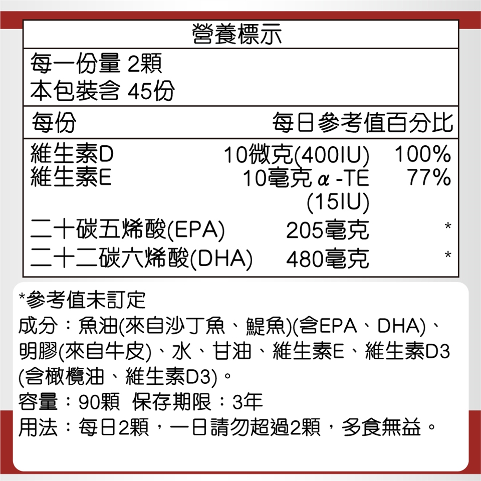 成分:天然深海魚油濃縮物(來自沙丁魚與鯷魚)、明膠、甘油、水、天然維生素E、天然維生素D3