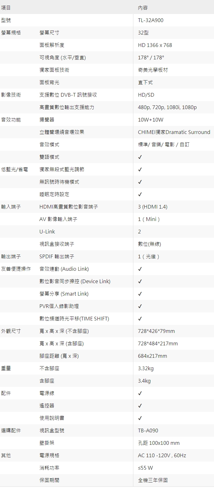 CHIMEI奇美 32吋低藍光液晶顯示器+視訊盒(TL-32A900)