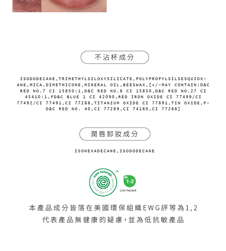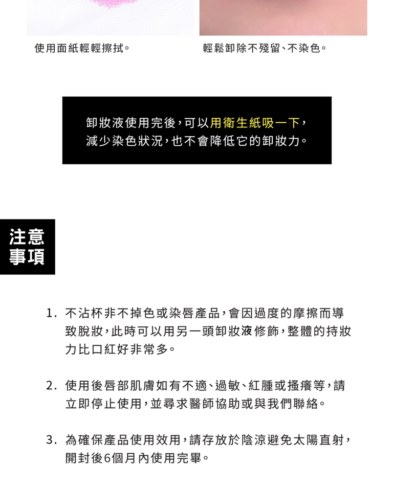 2.使用後唇部肌膚如有不適、過敏、紅腫或搔癢等,請立即停止使用,尋求醫師協助或與我們聯絡。