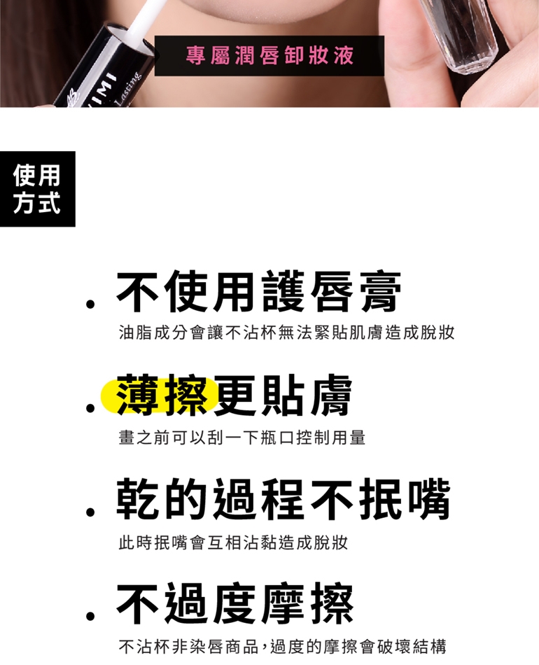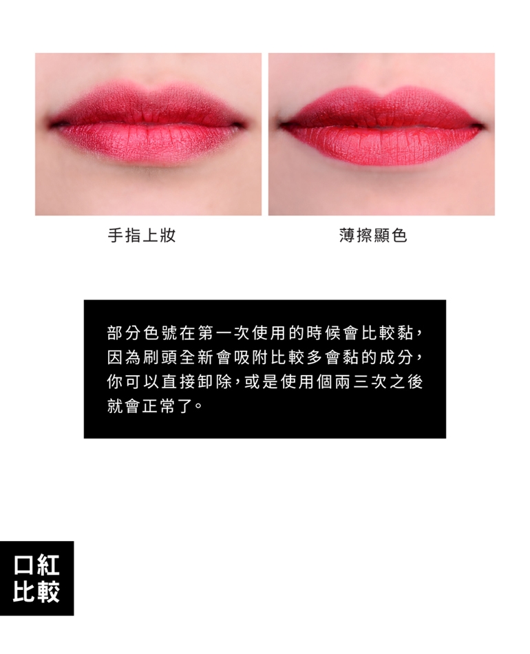 ★使用前確保唇部無其他產品,因會影響產品的附著力(ex:護唇膏)。