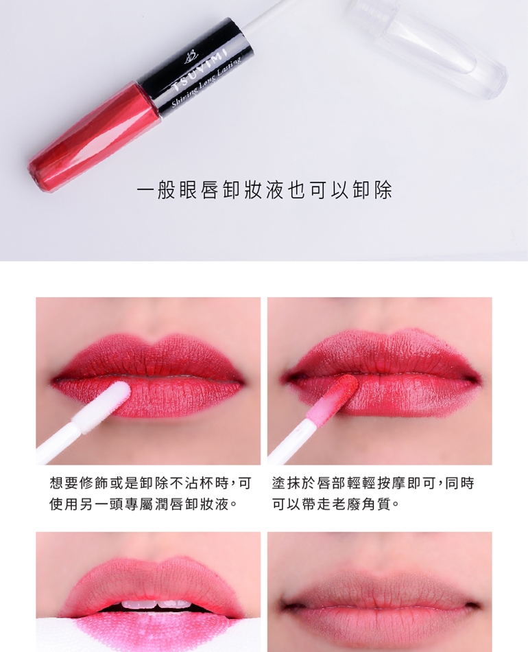 透明端為專屬潤唇卸妝液,將卸妝液擦上唇部,再用紙巾擦拭即可。