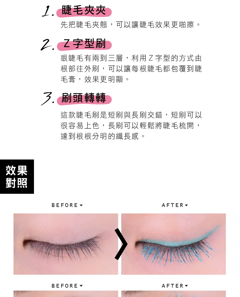 2.Z字型刷,眼睫毛有兩到三層,利用Z字型的方式由根部往外刷,可以讓每根睫毛都包覆到睫毛膏,效果更明顯。