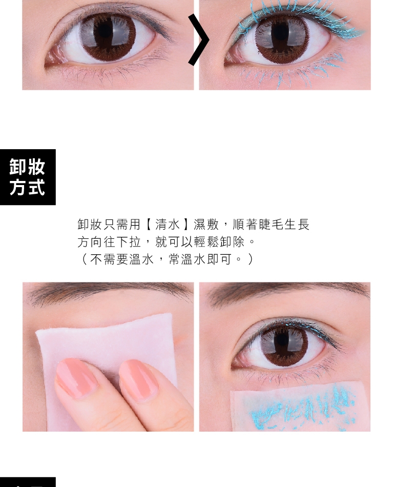 1.卸妝只需要【清水】濕敷,順著睫毛生長方向往下擦拭,就可以輕鬆卸除。(不需要溫水,常溫水即可。)