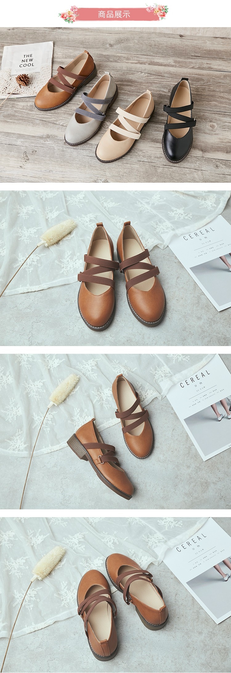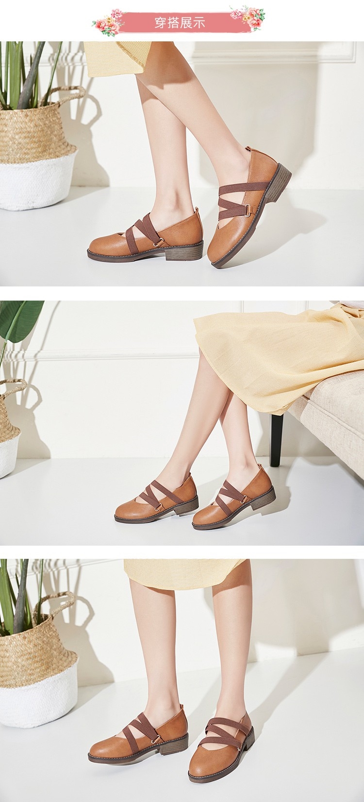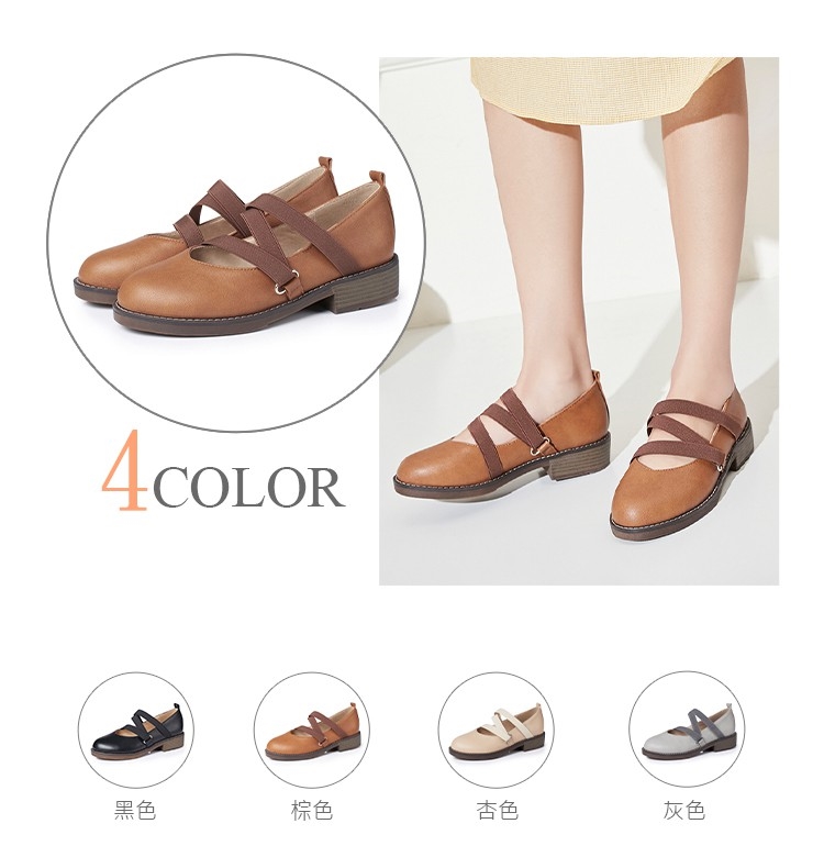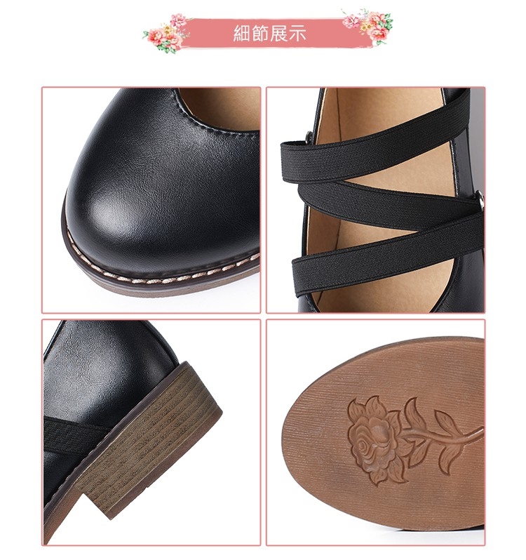 【Kissxxx】圓頭跟鞋低跟鞋/復古小圓頭彈力織帶造型低跟鞋 棕