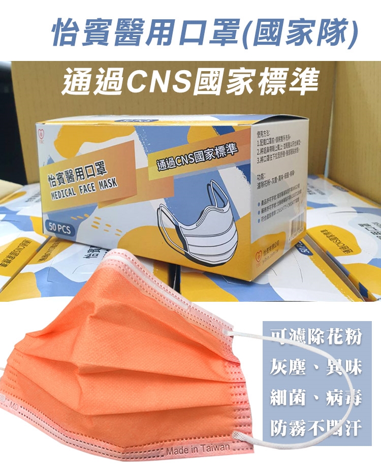 【怡賓】眼鏡防霧型醫療級三層口罩50片/盒-南瓜橘(YB-S3AF)