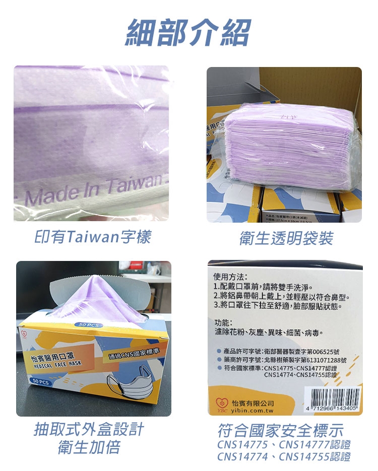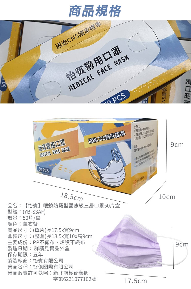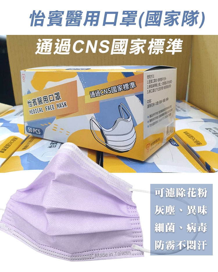 【怡賓】眼鏡防霧型醫療級三層口罩50片/盒-薰衣紫(YB-S3AF)