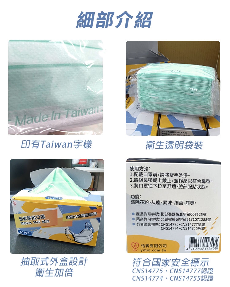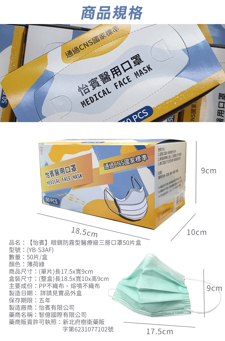 【怡賓】眼鏡防霧型醫療級三層口罩50片/盒-薄荷綠(YB-S3AF)
