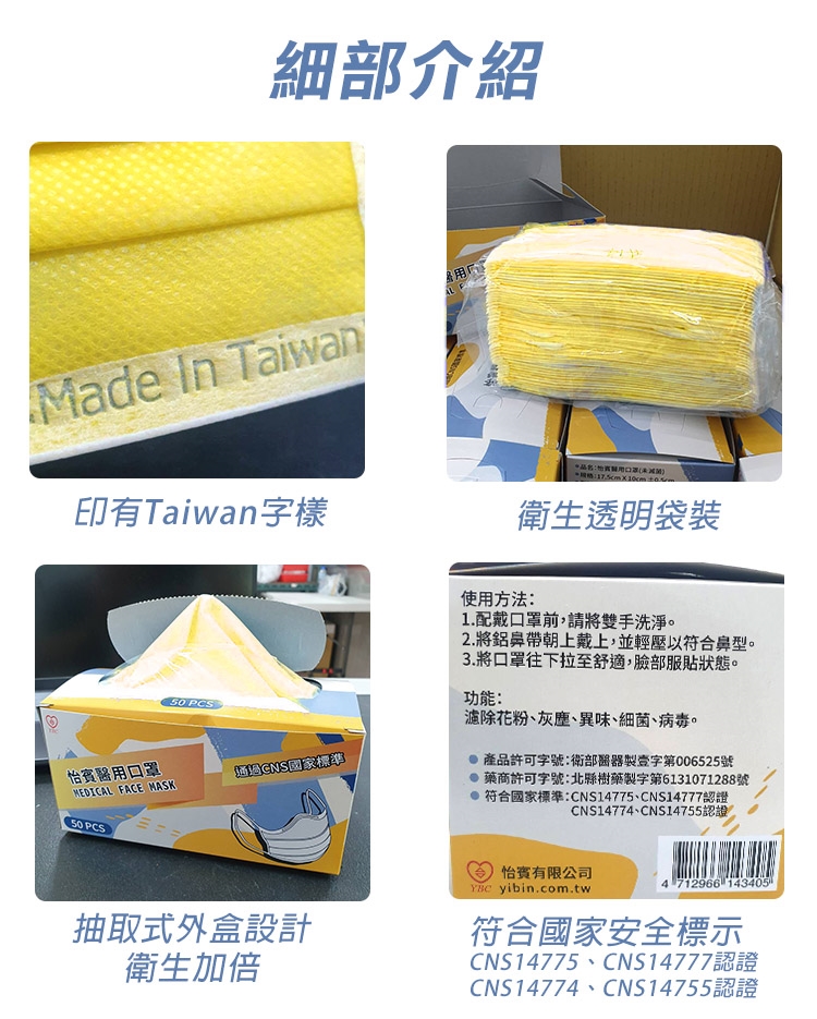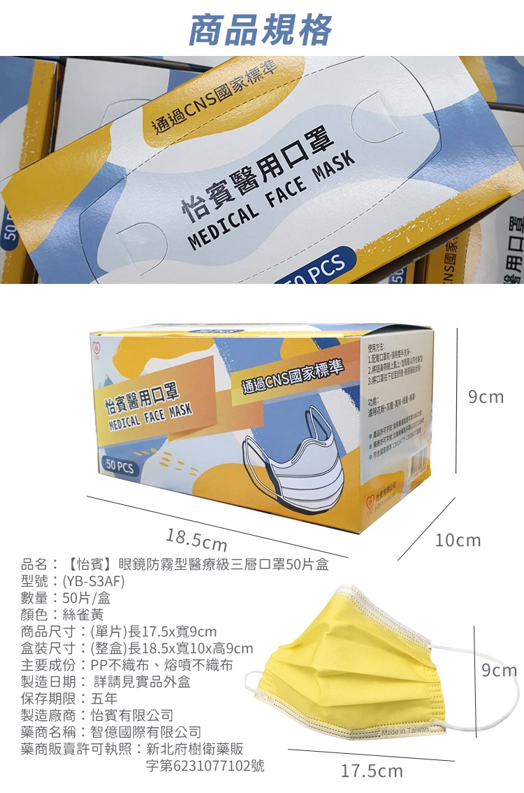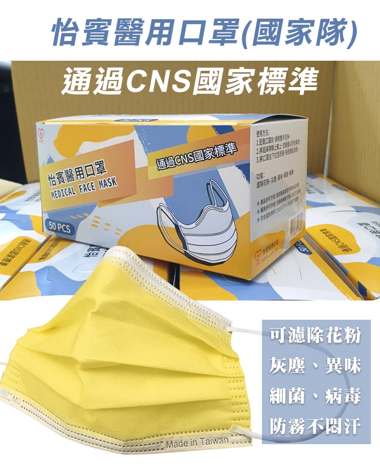 【怡賓】眼鏡防霧型醫療級三層口罩50片/盒-絲雀黃(YB-S3AF)