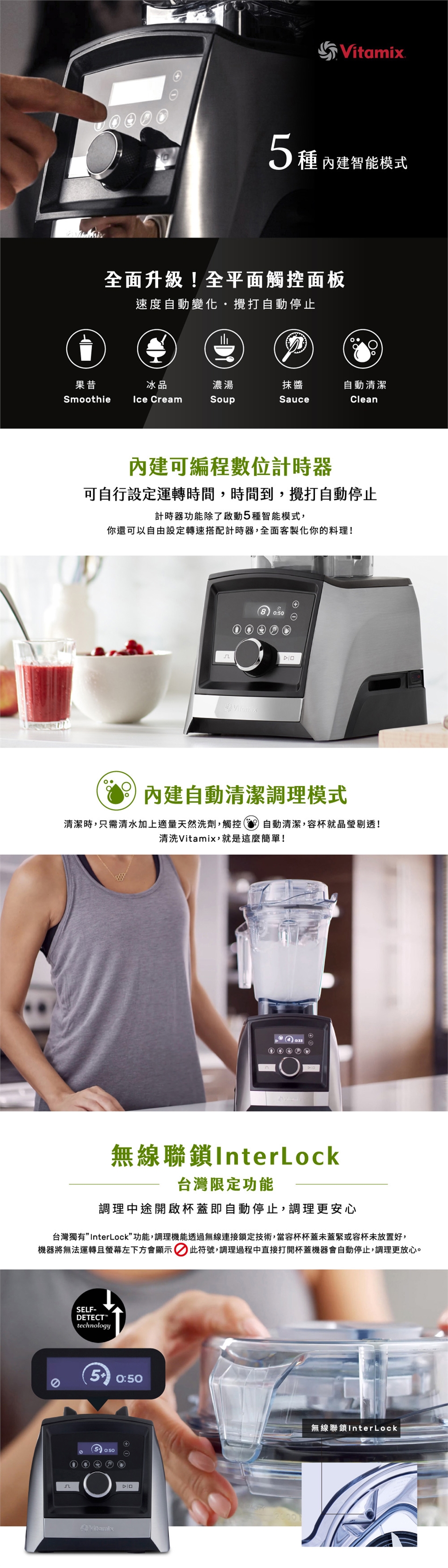 ●Vitamix延續經典全面升級!完美結合新科技!觸控式面板新體驗,保留經典旋鈕變速操作,增設5項智能調理程式─果昔、冰品、濃湯、抹醬、自動清潔,程式啟動自動計時調理,攪打完成自動停止,您還可以自行設定速度搭配攪打時間,美味料理自由變化,分分秒秒由你掌握。