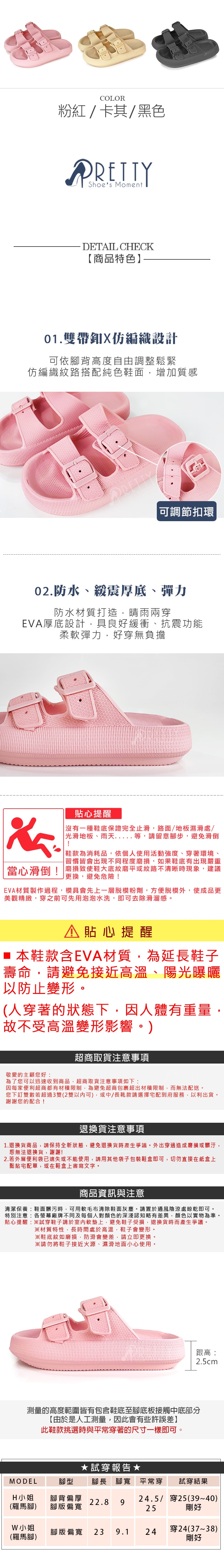 P.S. 貼心提醒,本鞋款含EVA材質,為延長鞋子壽命,請避免接近高溫、陽光曝曬,以防止變形。