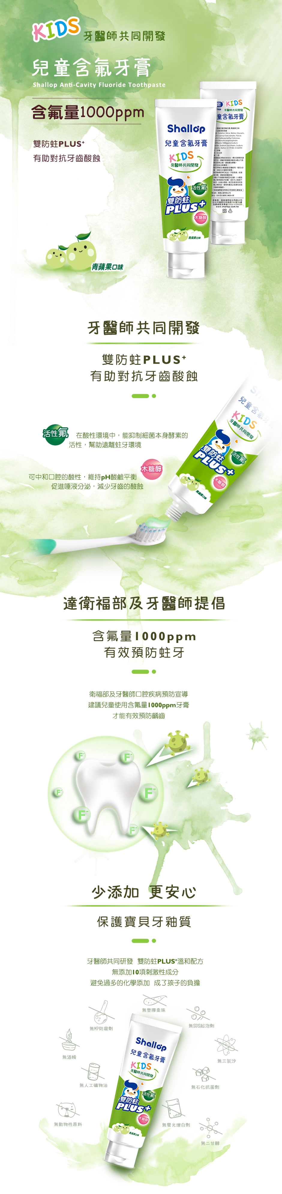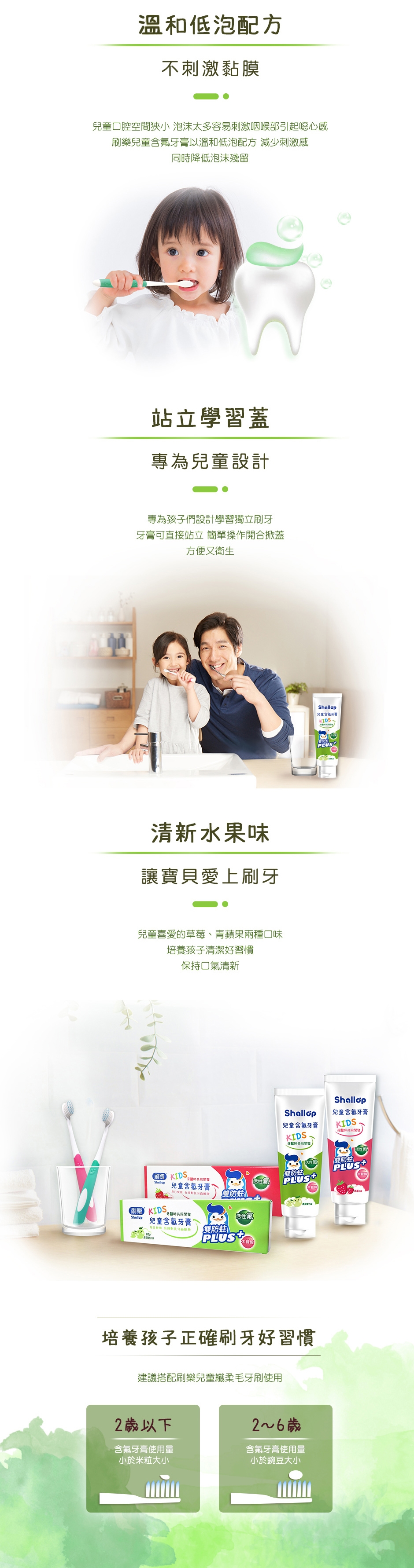 1. 2歲以下孩童使用綠豆大的量;2-6 歲孩童之使用豌豆大的量,且於大人監督下刷牙,以減少吞食。若正在使用任何含氟之補充品,使用本產品之前請先諮詢牙醫師或醫師。