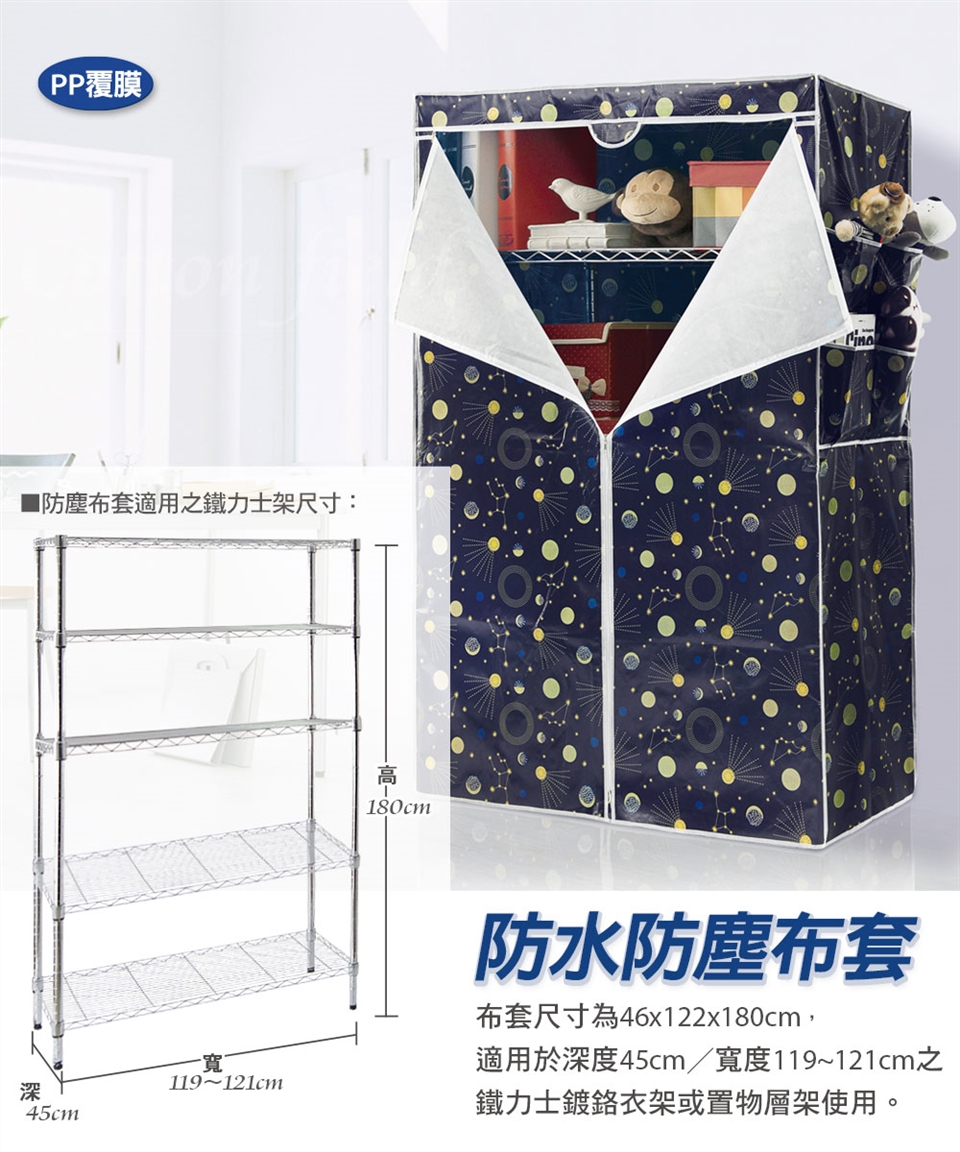 搭配時尚印花,專為台灣鍍鉻鐵力士架量身打造,完美合身的防塵布套,輕鬆解決您多年的困擾,花色多樣輕鬆就能穿上。全新PP覆膜防水防污防塵,側邊增加配件雜物收納袋,讓收納分類更簡單,井然有序,居家整潔、清爽,充滿生氣。