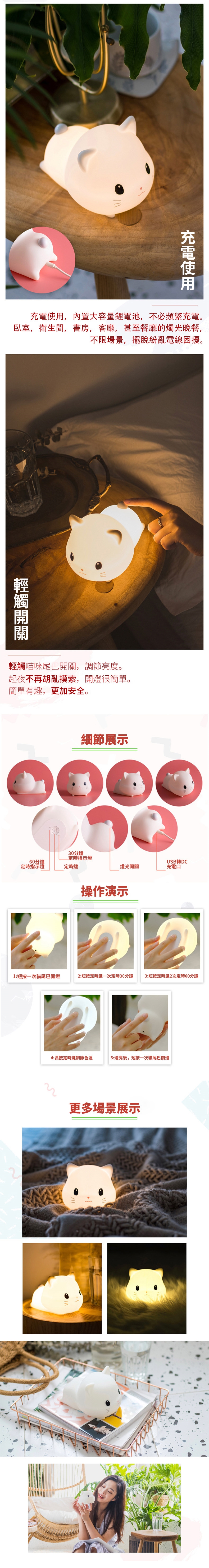 ◆超萌貓造型,尾巴觸控開關,無極調整光亮度