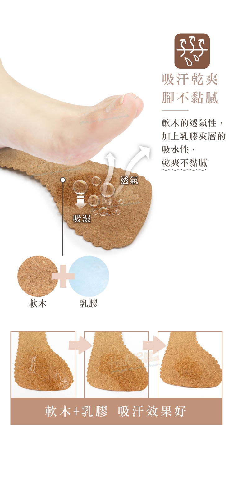 軟木的透氣性,加上乳膠夾層的吸水性,乾爽不黏膩