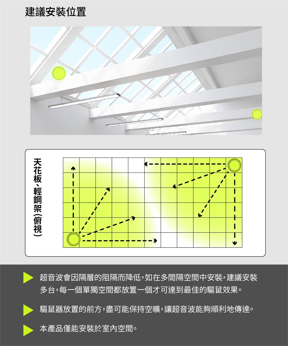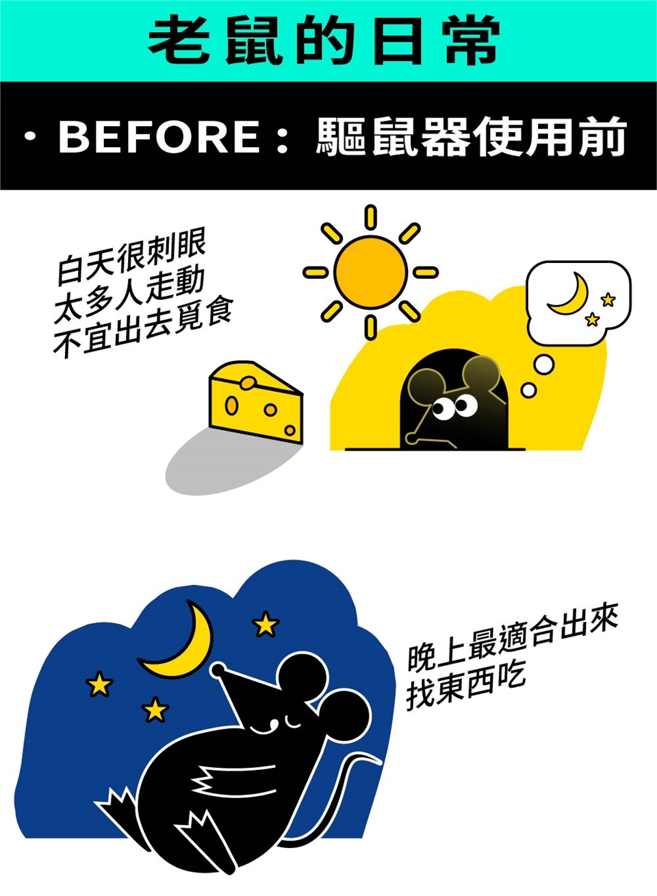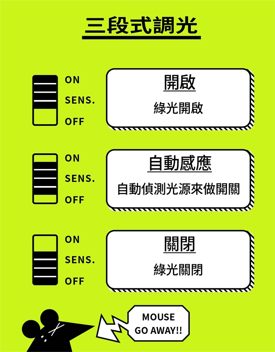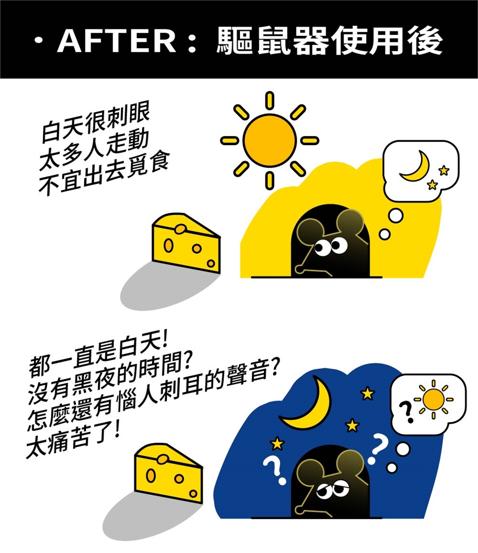 ● DigiMax★UP-1B1 綠光驅鼠光波乃是利用老鼠視覺辨識色的特性,使其難以分辨白天黑夜,進而造成鼠患對環境的不安與混亂而自行遠離居所。