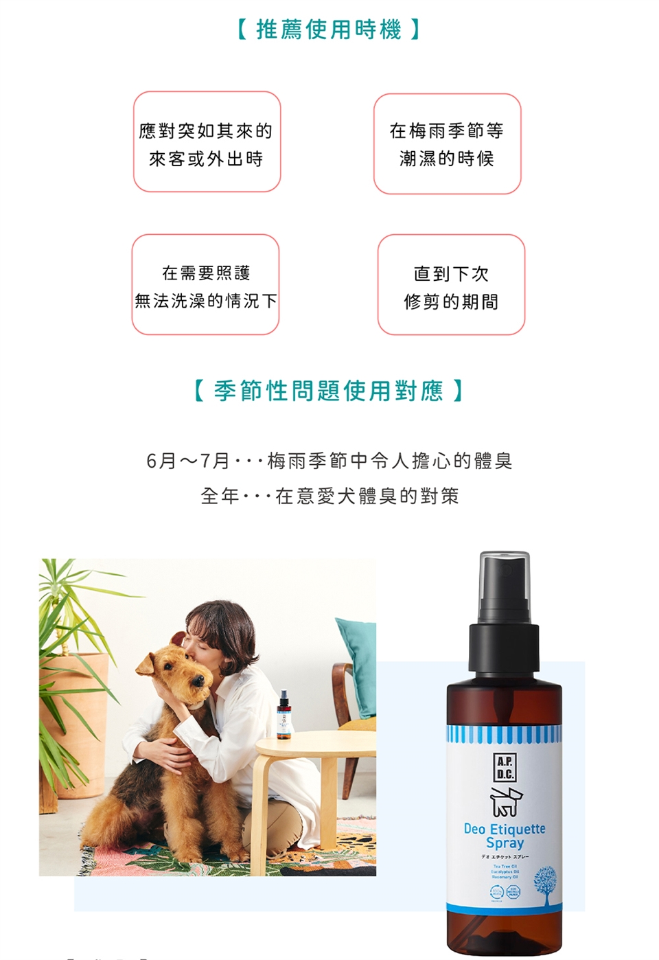梳毛前,均勻噴灑於全身(避免噴至眼睛),使用適合的梳具梳理毛髮整至柔順即可。