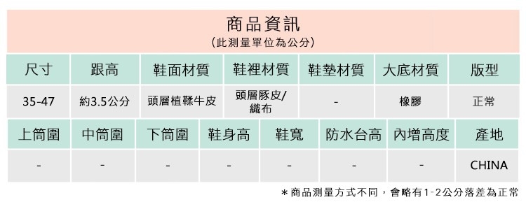 2.鞋類商品依功能及用途之不同,鞋底各有其止滑係數之個別不同,使用鞋類商品請用於正常平坦之路面,非雨鞋或雨靴類商品,請避免穿著於下雨濕滑路面上行走。